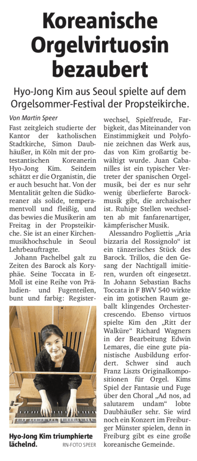 Hyo-Jong Kim aus Seoul ist eine Studienkollegin von Propsteikantor Simon Daubhäußer aus Kölner Zeiten. Jedes Jahr kehrt die Koreanerin aus Seoul in ihre studentische Heimat nach Europa zurück, um Konzerte zu geben. In die Propsteikirche kam sie am 17.08. Freuen konnte man sich auf symphonische Klassiker der Orgeltradition und technische Brillanz.