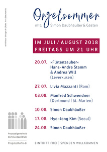 Den Auftakt am 20.07.2018 um 21.00 Uhr machten der bundesweit seit Jahrzehnten bekannte Organist Hans-André Stamm & Andrea Will, seine Partnerin an der Flöte. "Flötenzauber" wurde ein leichter, heiterer Einstieg in die Sommerkonzerte.