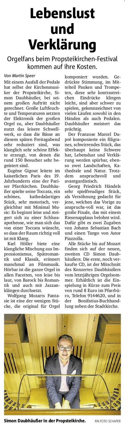 Hier finden Sie den Bericht über das vierte Orgelkonzert von Simon Daubhäußer aus den Ruhr-Nachrichten vom 13.08.2018 von Martin Speer: