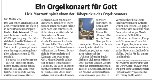 Mit Livia Mazzanti folgte am 27.07. darauf das "enfant terrible" der römischen Organistenszene. Selbstbewusst, innovativ und brillant gespielt sind die Programme der Italienerin.